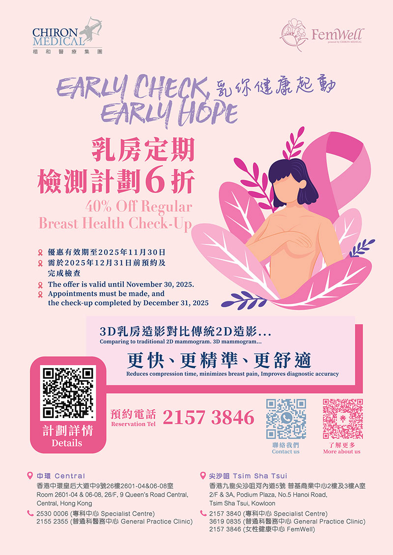 楷和醫療集團一直提供全面的醫療服務給大眾,同時致力提升女性健康及支持基層社群。踏入每年10月的國際乳癌關注月,我們與各合作機構共同發起EARLY CHECK, EARLY HOPE乳你健康起動計劃,提升女性對乳癌了解及支援基層女性健康需要。通過各類乳健教育外展活動及推廣「粉紅服飾日」,提高公眾對乳癌的認識,攜手為女性健康帶來更多支持與力量!